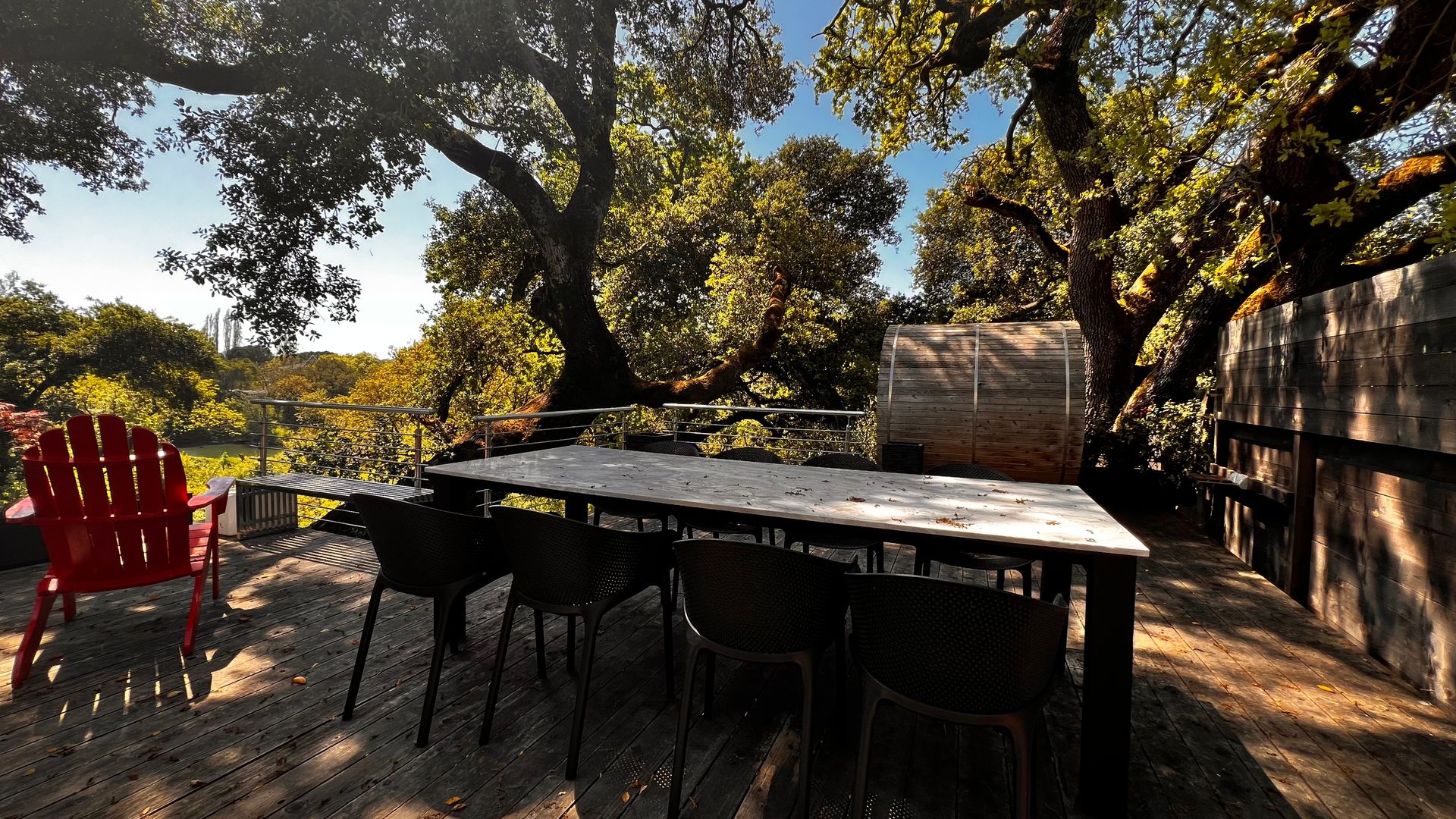 • Sliding glass doors leading to a deck with west-facing tree-top and river views