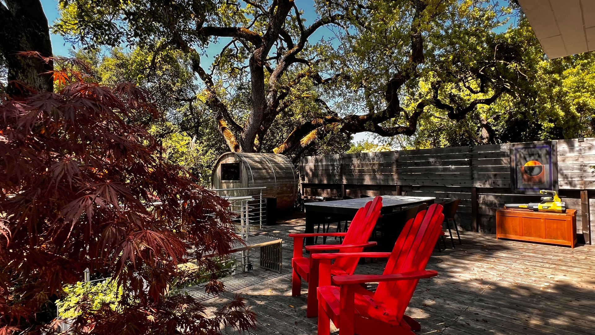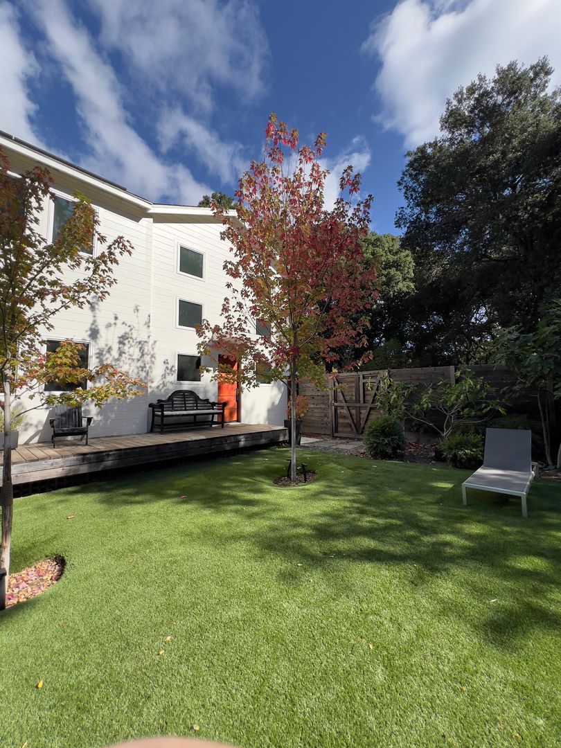 • Lush landscaped backyard with mature trees, lawn, and lounge space