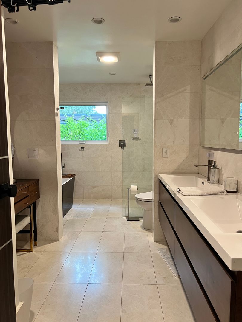 • Spa-inspired full bath downstairs with dual vanities, walk-in glass shower, and freestanding soaking tub